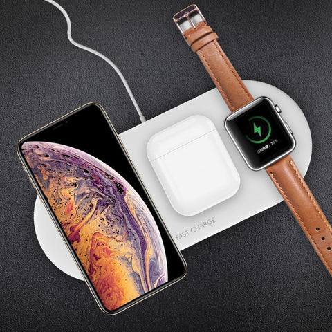 - 3-In-1 Wireless Charger Pad - Simultaneously charge up to three devices with ONLY 1 charging cable – an Apple Watch, AirPods, and an iPhone (8 or later) or Qi-enabled smartphones – all from one sleek charging mat. No need to connect three cables for each device anymore.