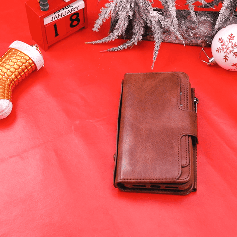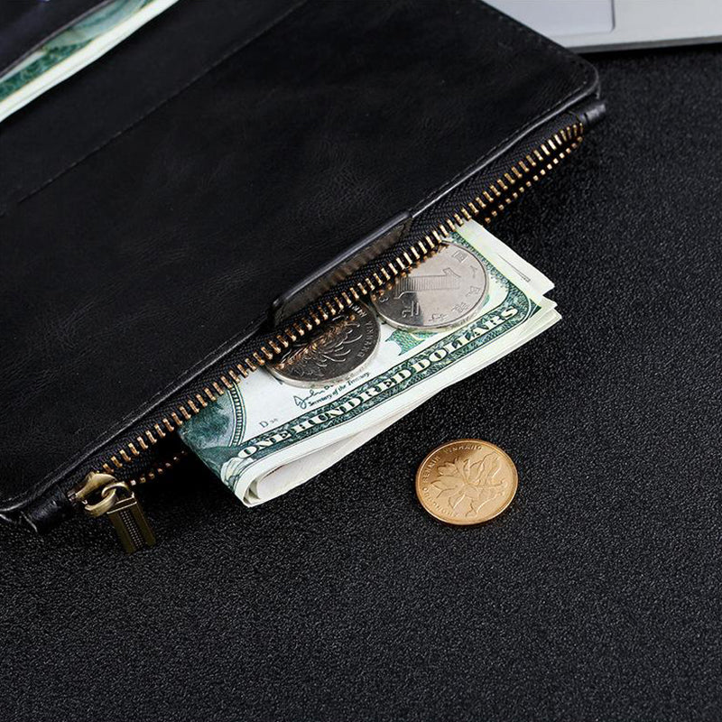 The wallet portfolio can store up to 6 credit cards, an ID picture slot, and a zipper pocket coin.